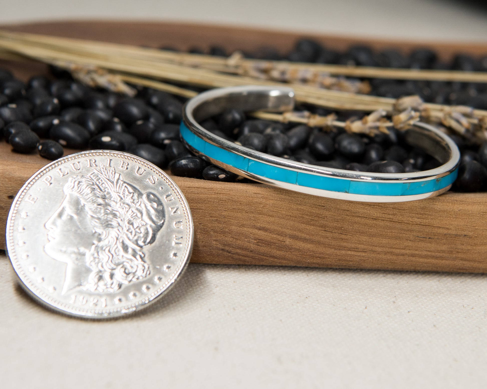 Kingman Turquoise Inlay Sterling Silver Cuff. This piece is elegant when worn alone but also pairs well with other bracelets to create your own look. Native American made.
